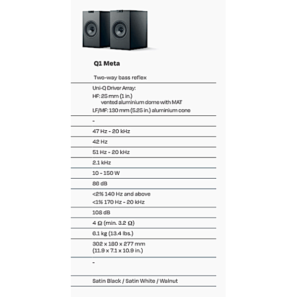 With a combination of a 130 mm (5.25 in) 12th generation Uni-Q driver array with MAT and Computational Fluid Dynamics (CFD) port, the Q1 Meta delivers remarkable audio performance from its modest footprint.