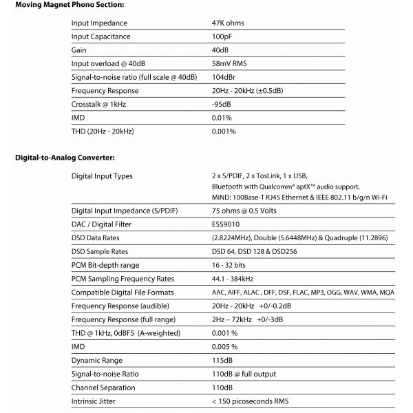 8 digital inputs include USB (hi-res audio), SPDIF (2), Optical (2), Qualcomm aptX audio for Bluetooth®, WiFi and Ethernet.