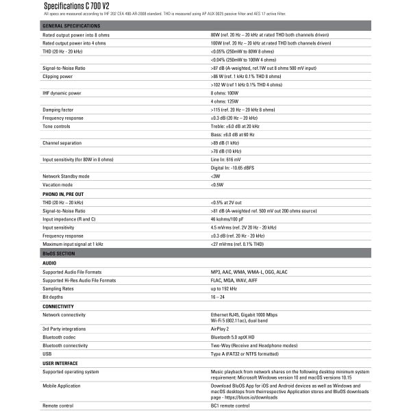 The C 700 V2 BluOS Streaming Amplifier is a compact, high-value all-in-one sound system that builds upon the success of its predecessor with an upgraded DAC, enhanced connectivity, expanded output capabilities, more control options, and even more advanced processing.