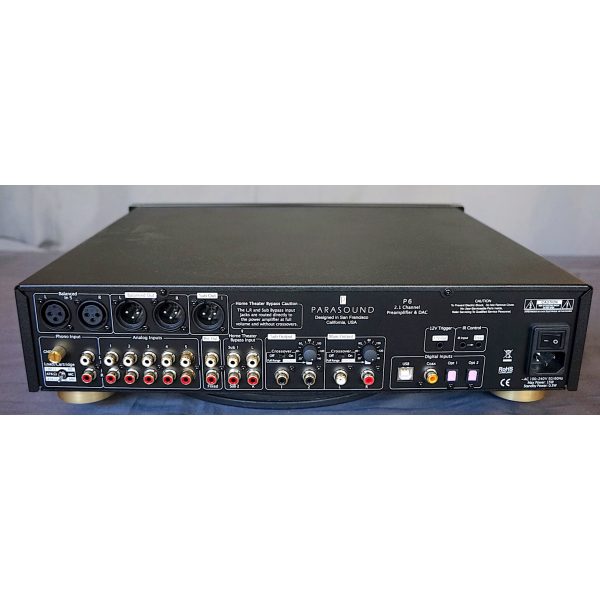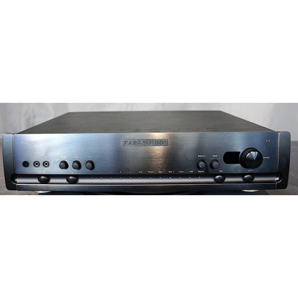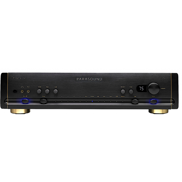 From Parasound: Designed as a true 2.1‑channel control center, the P6 adds the pieces most systems are missing: an ESS Sabre32 Reference DAC (ES9018K2M) with USB up to 384 kHz/32‑bit and native DSD64/128/256, coax/optical 192/24, fully analog bass management with independent high‑pass/low‑pass crossovers and front‑panel sub level, MM/MC/MI phono (100 Ω or 47 kΩ), balanced XLR input, balanced & RCA pre‑outs, plus XLR + dual RCA sub outs. It also uses a resistor‑ladder volume control for fine, low‑noise steps, includes a high‑current TI TPA6120 headphone amp, and offers Home Theater Bypass for seamless 2‑channel + surround integration.