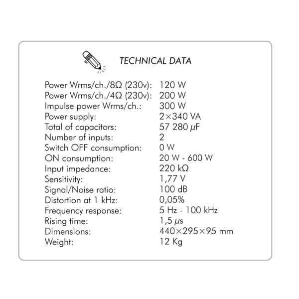 The AM200 Signature offers a power of 2 x 120 W into 8 Ω and 2 x 200 W into 4 Ohms. In bridged mono mode, its power is tripled, reaching 1 x 360 W into 8 Ω and 1 x 600 W into 4 Ohms. Thanks to its symmetrical stages and toroidal transformers, this amplifier guarantees an instantaneous response and unfailing support for the associated speakers. What particularly distinguishes the AM200 Signature is its exceptional sound quality. It offers a balanced, fast and detailed sound, with remarkable musical analysis capabilities. Voices are reproduced naturally and instruments are reproduced with great precision. Whether in deep bass or bright treble, this amplifier offers an articulate and readable sound reproduction. It also allows for an opening of the sound image and a proven relief. The AM200 Signature is designed to meet all demands. Its current capabilities allow it to power a wide range of speakers, from bookshelves to columns, allowing them to express their full potential. This amplifier offers exceptional dynamics and remarkable versatility, suitable for all musical genres. In terms of connectivity, the AM200 Signature is equipped with RCA inputs and outputs.