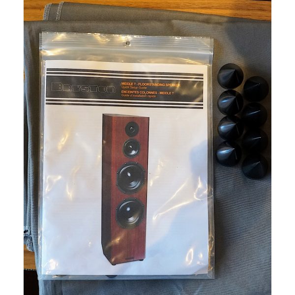 From Bryston: Power and ease meet grace and nuance in the BrystonMiddle T loudspeaker. The understated style and neat proportions yet extraordinary performance of this model make it ideally suited for home theater or stereo use in rooms which demand world class fidelity without the towering visual dominance of our largest floor standing models.The Middle T offers astonishing impact and clarity for a loudspeaker of its size. Anticipate startling presence, deep and tight bass, and clear, truthful midrange and upper frequencies. The Middle T delivers a level of performance that is unqualified by size or price. Deep bass extends to 33Hz thanks to twin 8 inch custom woofers loaded in a rear-ported cabinet. Bryston’s proprietary midrange and tweeter ably replay their respective ranges with absolute accuracy in tone and detail. Both the midrange and woofers feature special ceramic-coated aluminum diaphragms, long throw suspensions, and very powerful motors. A lightning fast titanium dome tweeter achieves remarkable detail due to uncommon strength to weight ratio. Extensively braced cabinet boasts 3/4 inch thick walls and a massive 1½ inch thick baffle ensure that the only sound you hear from these speakers comes from the unique set of purpose built drivers.