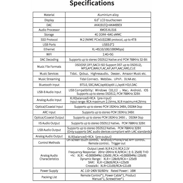 USB Audio Output: Support up to stereo DSD512, PCM 768KHz 32Bit