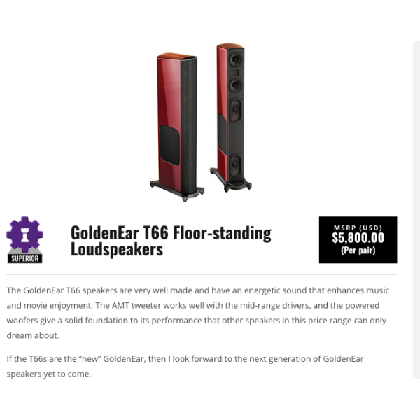The T66 is the first model in GoldenEar’s new T Series. While it boasts several significant refinements of our time-tested design concepts, the T66 is undeniably a GoldenEar loudspeaker, placing beautiful sound and music before all else.