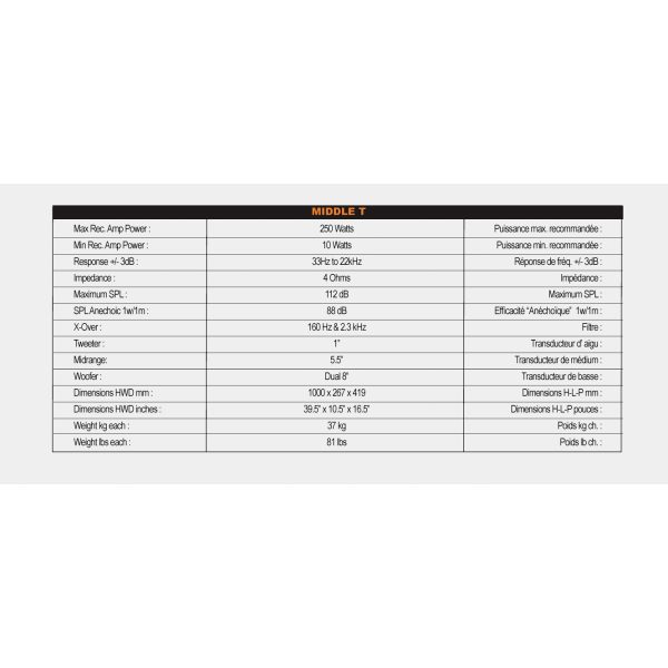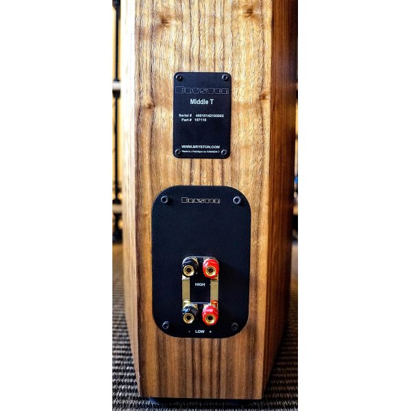 From Bryston: Power and ease meet grace and nuance in the BrystonMiddle T loudspeaker. The understated style and neat proportions yet extraordinary performance of this model make it ideally suited for home theater or stereo use in rooms which demand world class fidelity without the towering visual dominance of our largest floor standing models.The Middle T offers astonishing impact and clarity for a loudspeaker of its size. Anticipate startling presence, deep and tight bass, and clear, truthful midrange and upper frequencies. The Middle T delivers a level of performance that is unqualified by size or price. Deep bass extends to 33Hz thanks to twin 8 inch custom woofers loaded in a rear-ported cabinet. Bryston’s proprietary midrange and tweeter ably replay their respective ranges with absolute accuracy in tone and detail. Both the midrange and woofers feature special ceramic-coated aluminum diaphragms, long throw suspensions, and very powerful motors. A lightning fast titanium dome tweeter achieves remarkable detail due to uncommon strength to weight ratio. Extensively braced cabinet boasts 3/4 inch thick walls and a massive 1½ inch thick baffle ensure that the only sound you hear from these speakers comes from the unique set of purpose built drivers.