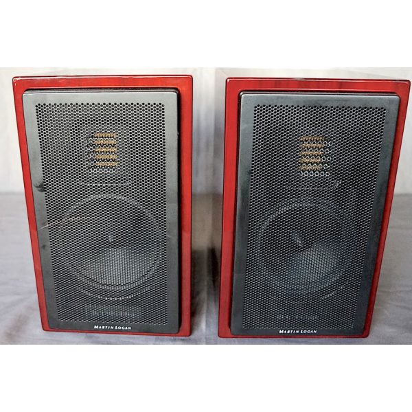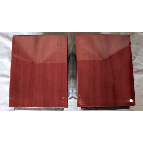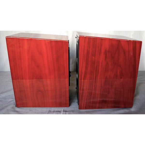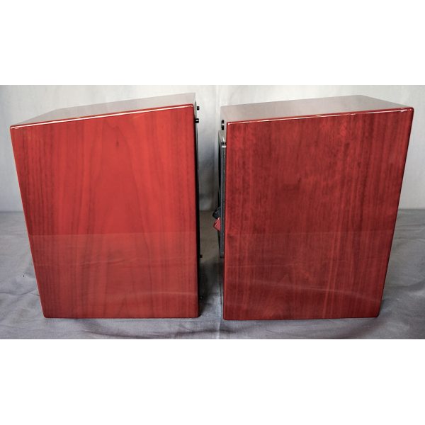 In nice condition - In beautiful Black Cherrywood Veneer. The high-gloss black cherrywood finish has deep cherry undertones and appears almost black in low light, giving them a unique and understated elegance that blends into any environment. Most of what you see on the cabinets are reflections from camera lighting.