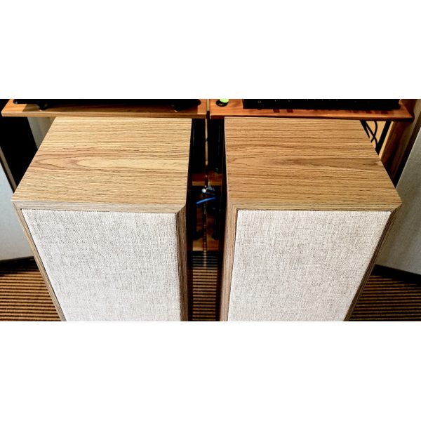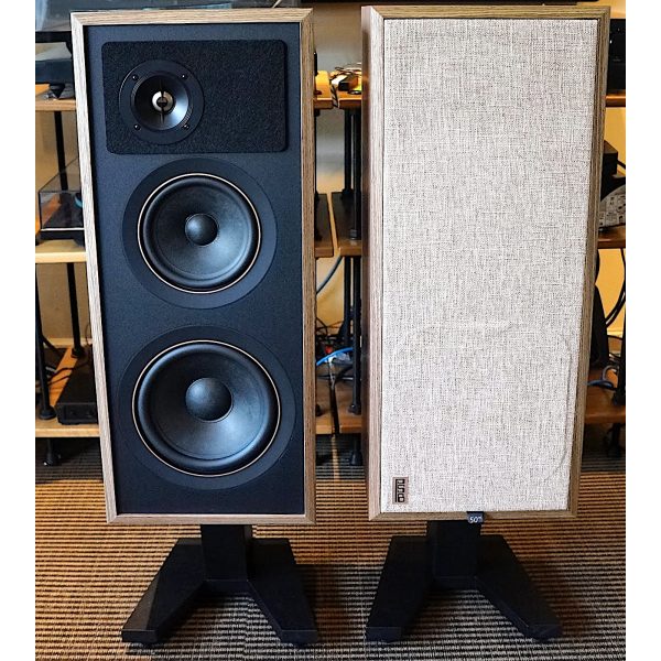 Retro-styled open-grained walnut veneer enclosure and dedicated speaker stands