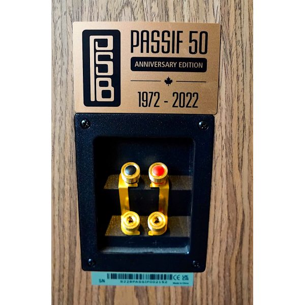 Magnetically attached woven cloth grilles 50th anniversary design touches, including original PSB logo and pull tab on the grille. Rear-panel plaque that reads “Passif 50 – 1972-2022,” adorned by a maple leaf