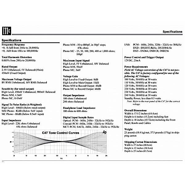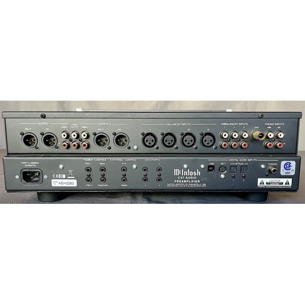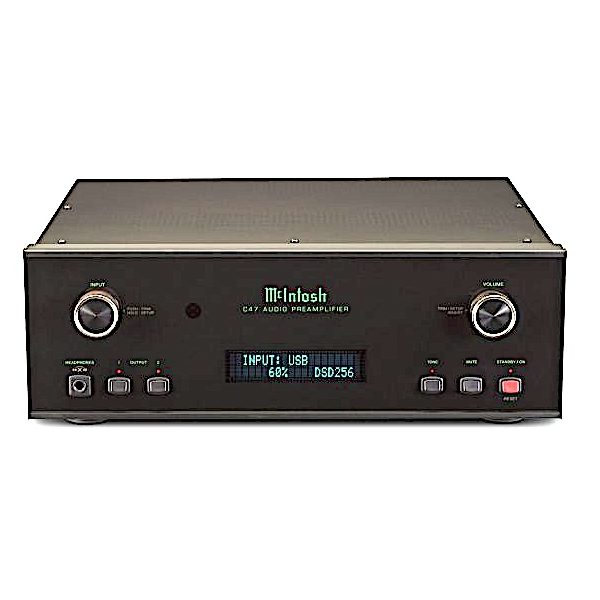 Incorporates classic McIntosh design cues, including a black glass front panel, knobs, illuminated logo and brushed aluminum end caps.