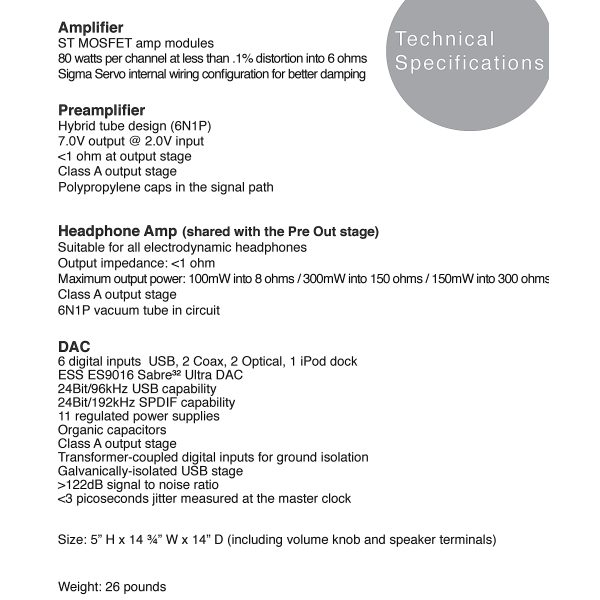 2 Channel Integrated Amplifier with Hi Rez DAC, Tube Preamp, and built-in iPod dock