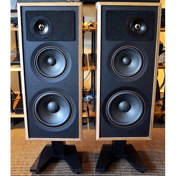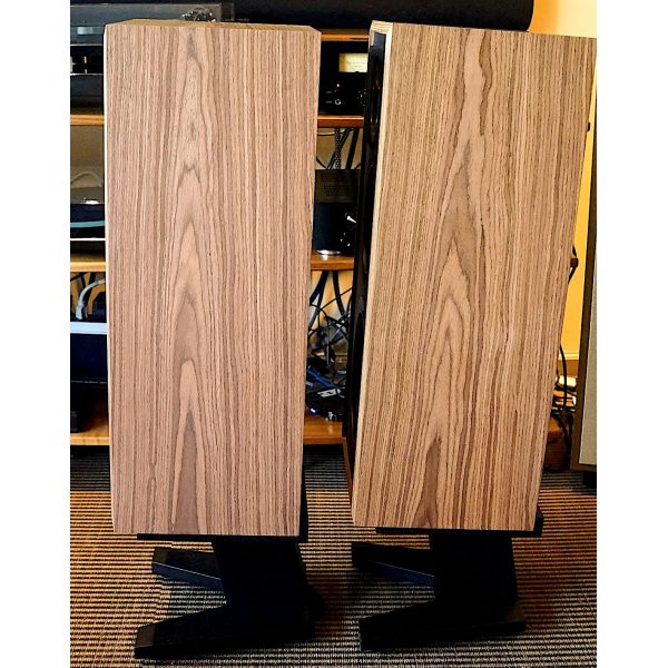 Retro-styled open-grained walnut veneer enclosure and dedicated speaker stands