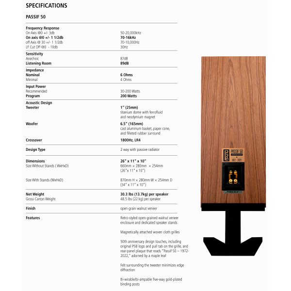 From PSB: Created to celebrate the 50th anniversary of PSB, the Passif 50 Standmount Loudspeaker harkens back to the legendary Passif II model that cemented the brand’s reputation for performance and value. The Passif 50 follows the design of its 1970’s ancestor while utilizing the latest technologies and leveraging five decades of acoustics research and design experience. The Passif 50 is the latest application of PSB’s True to Nature design philosophy.